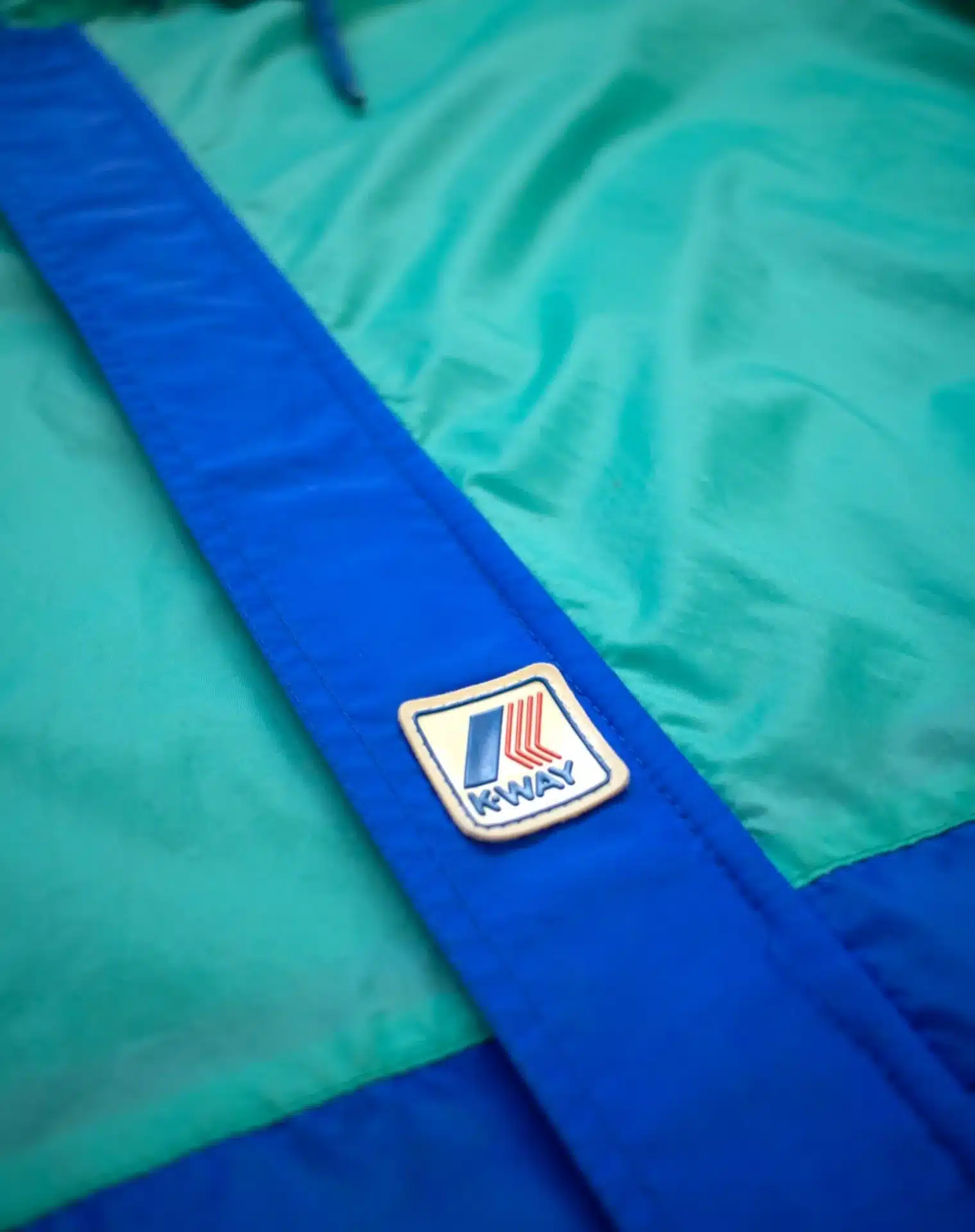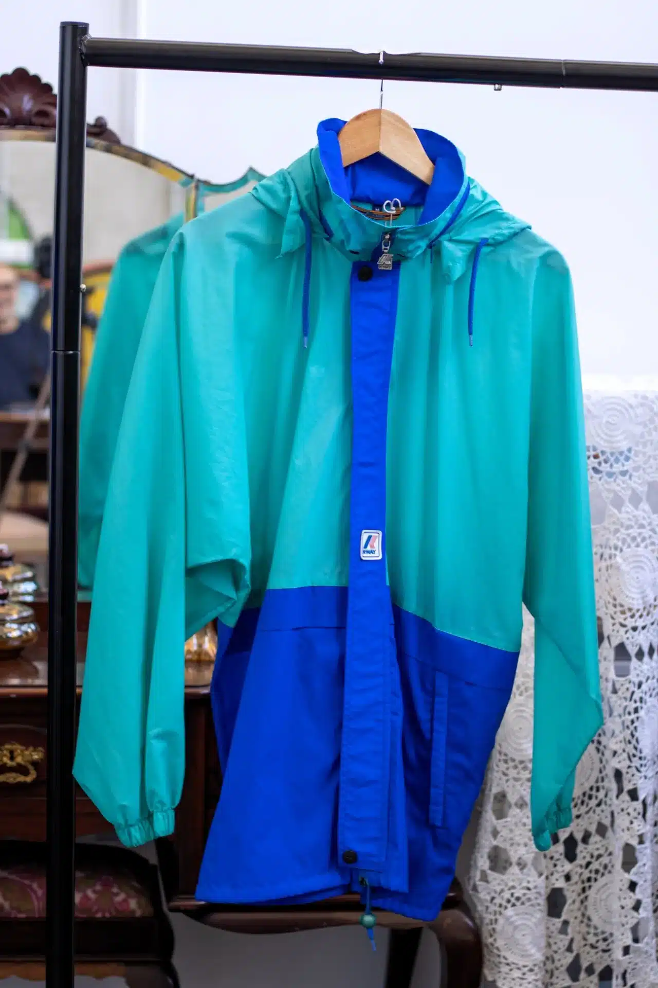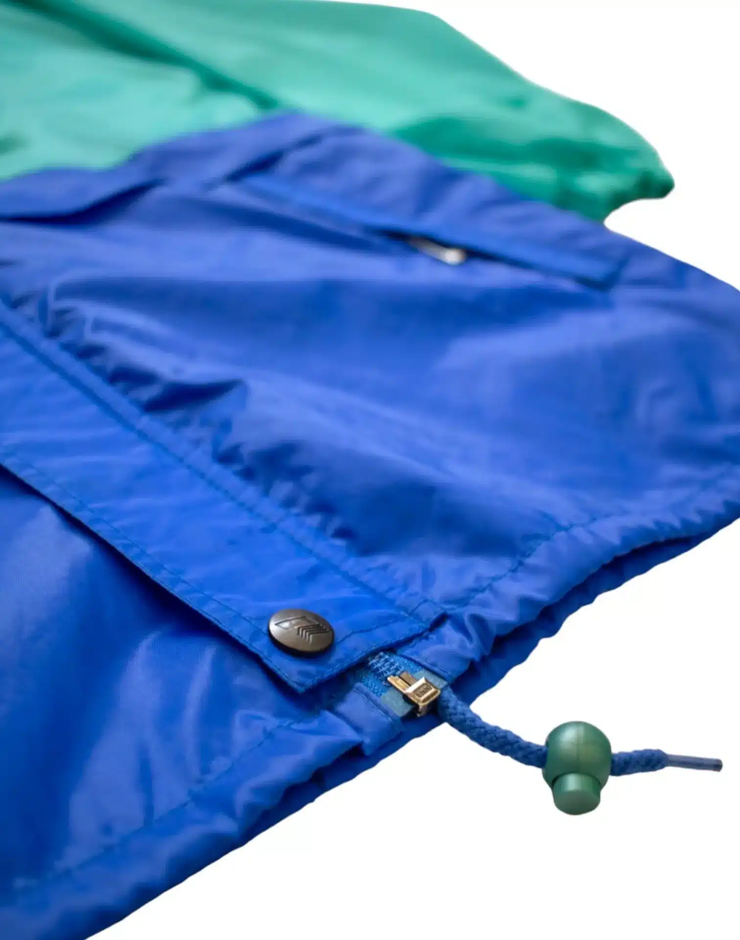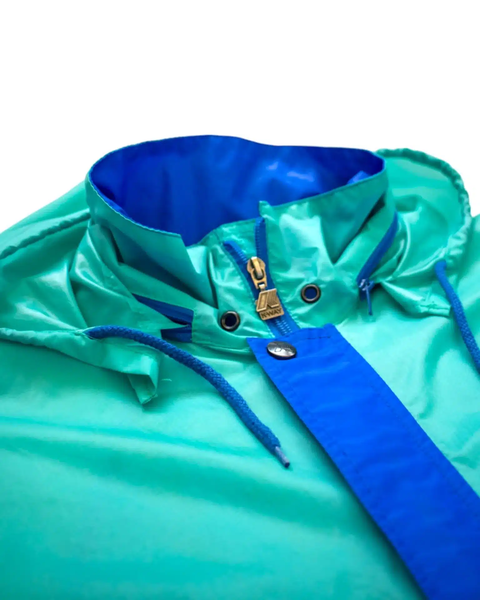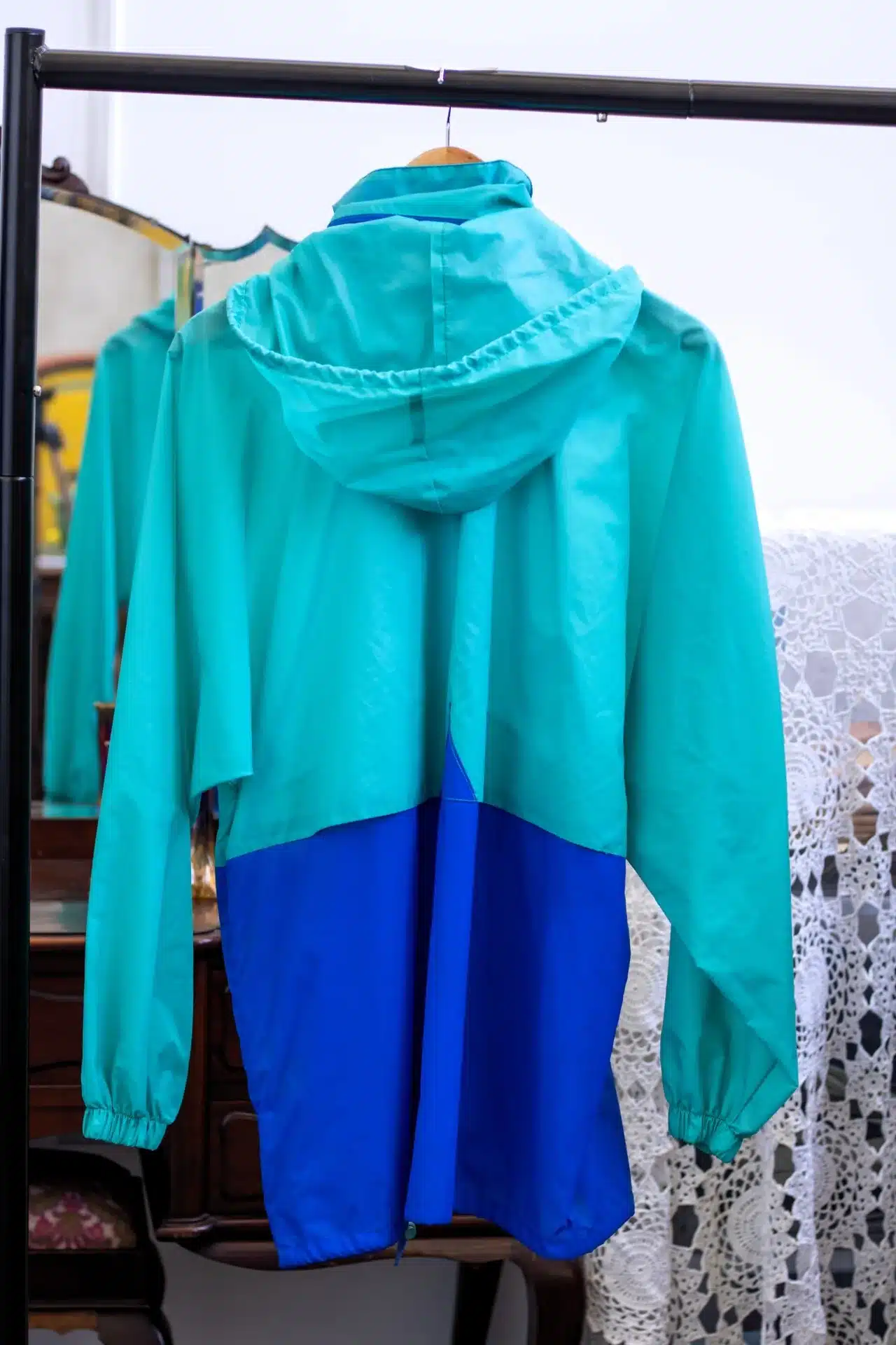 Casaco corta-vento vintage dos anos 80, com um design clássico em tons vibrantes de azul e verde-água.